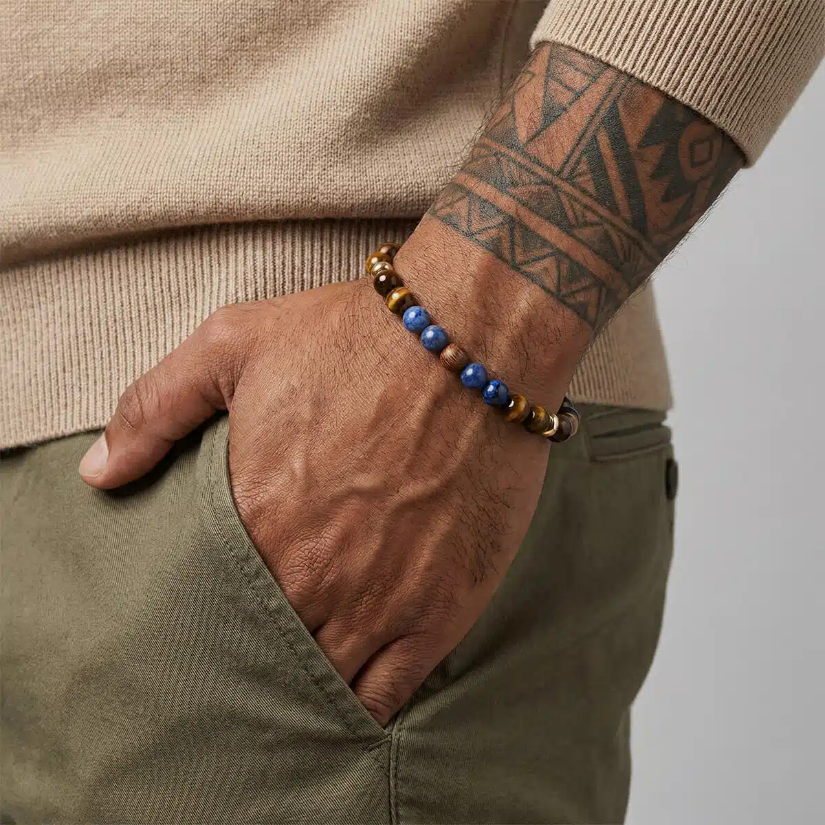 צמיד אופנתי ומלא נוכחות המשלב את הכחול הלילי המעמיק של דיומורטיריט עם הברק המהפנט של עין הנמר בגוני קרמל וענבר.