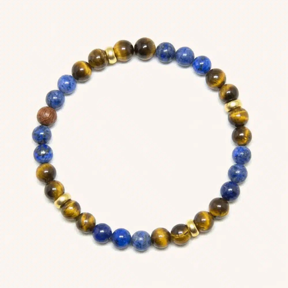 כחול-לילה פוגש זהב-אדמה: דיומורטיריט ועין הנמר עם נגיעות זהב וחרוז עץ מרכזי. צמיד בניגודיות מושלמת שמושך תשומת לב ומשדרג כל מראה.