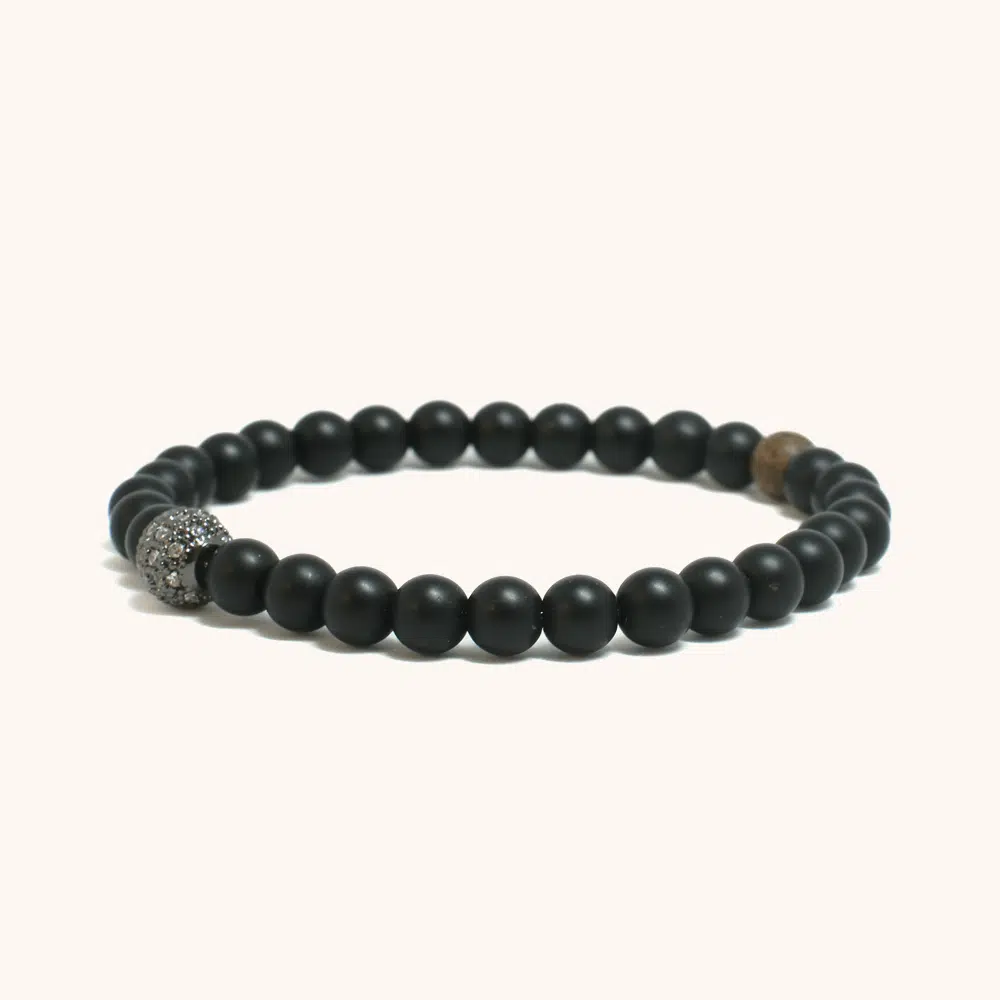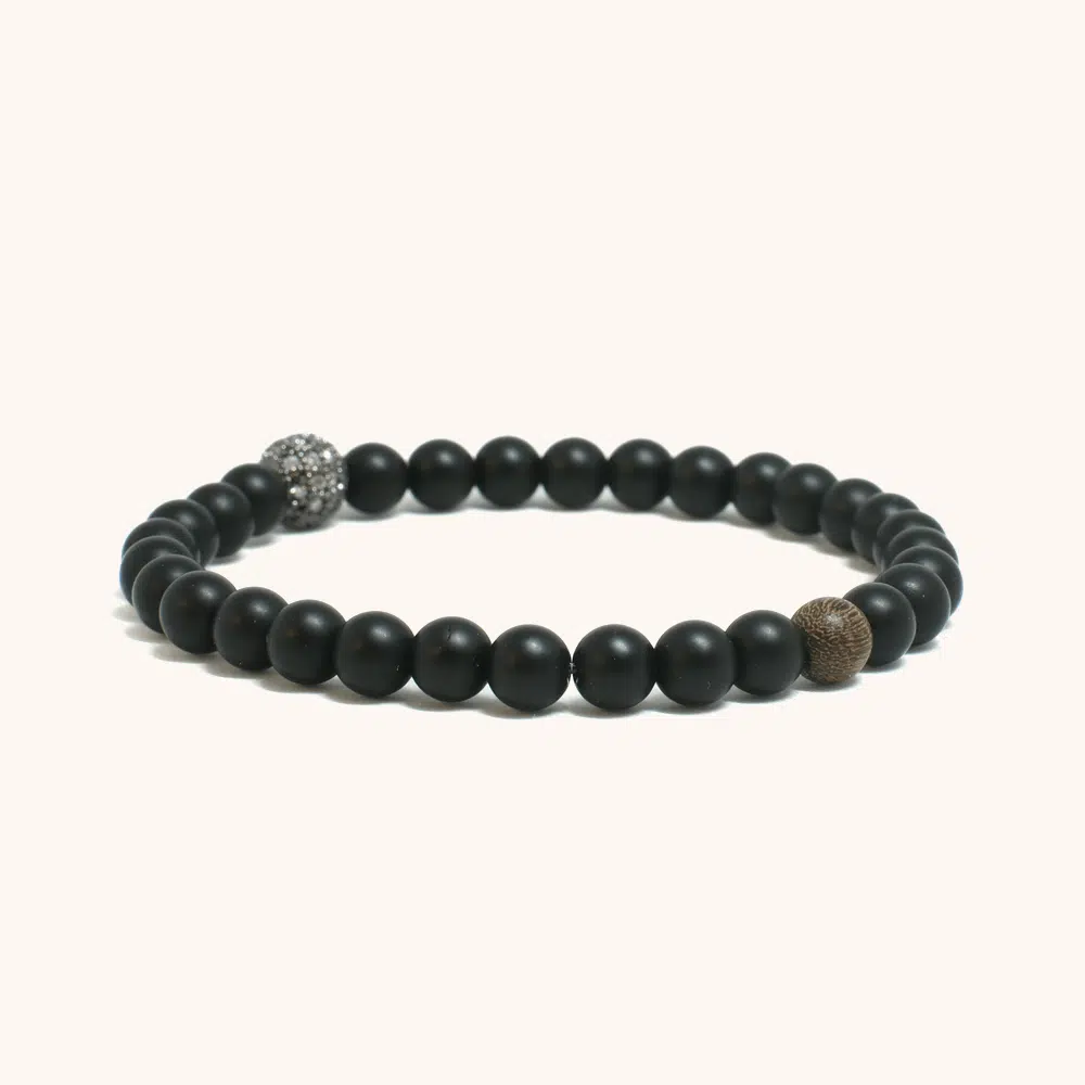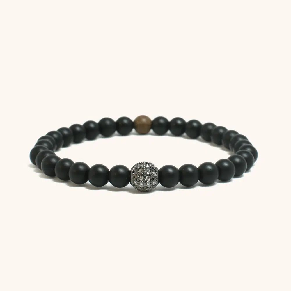 חרוזי אוניקס שחור מט חלקים עם כדור זירקונים נוצץ במרכז ועץ אגוז. צמיד עדין 6 מ"מ המשלב תחכום מינימליסטי עם ברק יוקרתי.