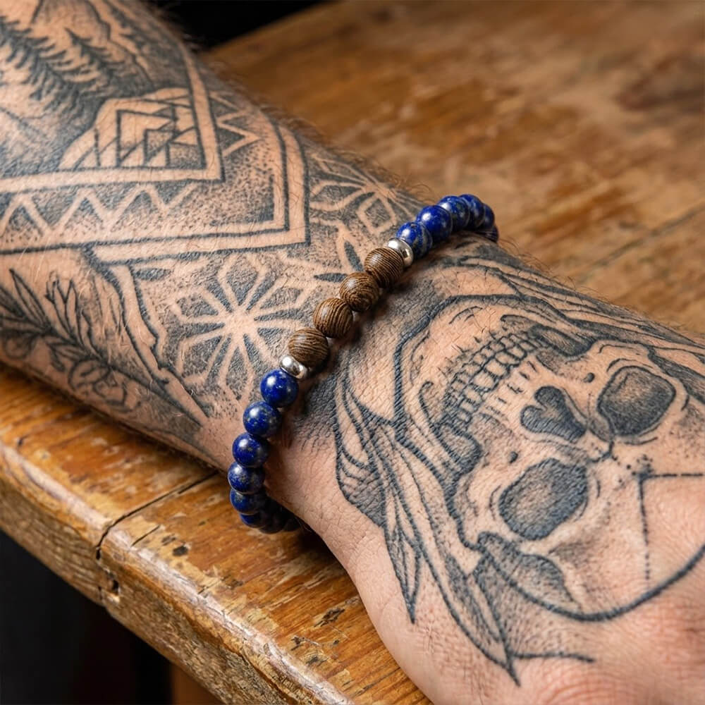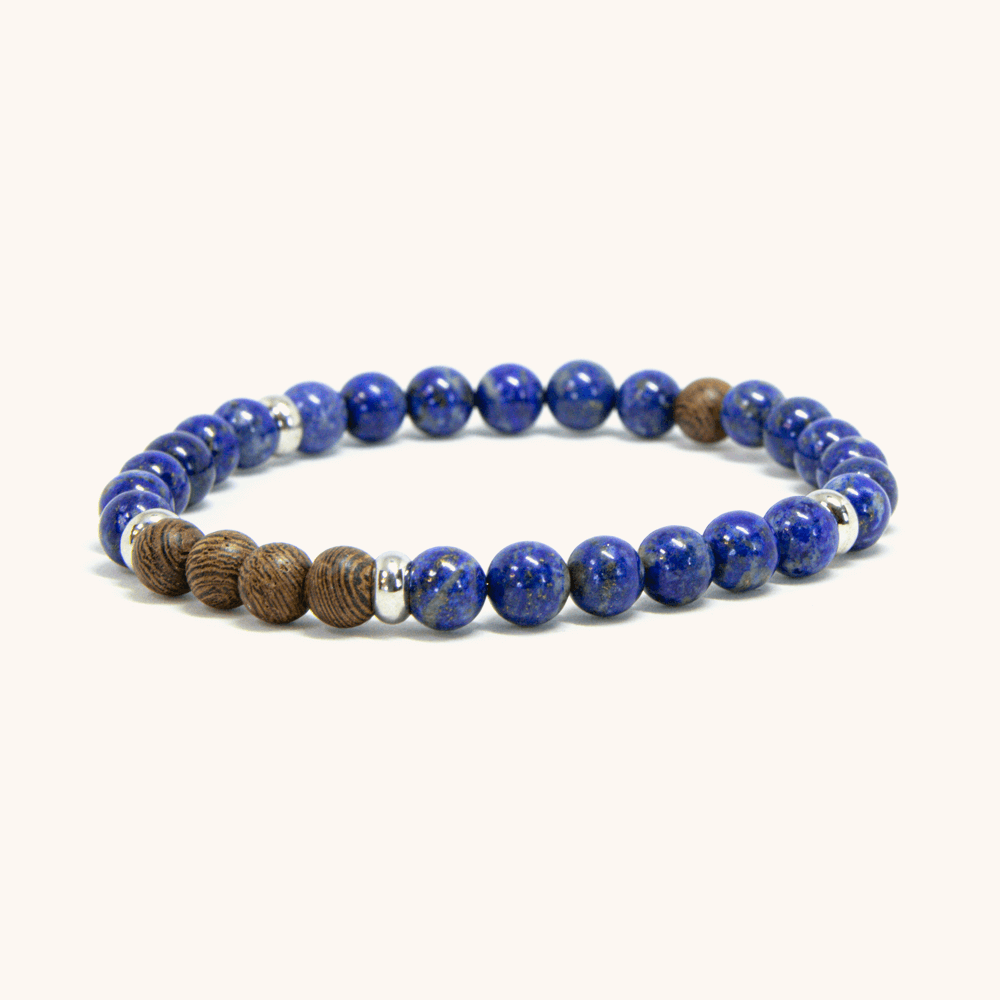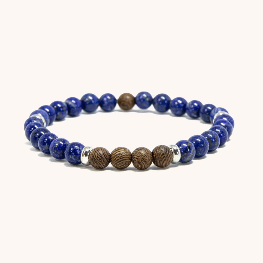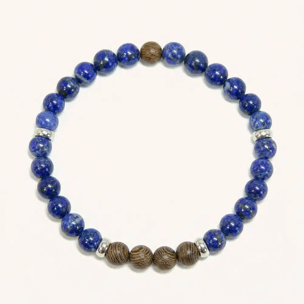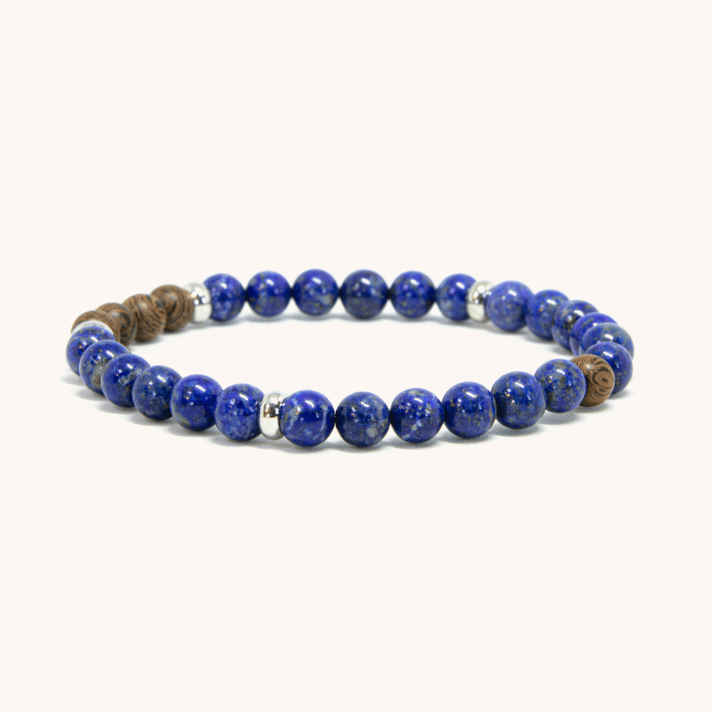 Deep blue Lapis Lazuli stones with natural gold flecks blend beautifully with distinctive striped Zebra Wood. The delicate 6mm beads create a refined bracelet that combines ancient luxury with modern elegance – perfect for adding a touch of royal blue sophistication to any look.